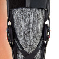 Das Produkt wurde mit zwei unabhängigen Verstärkungsgurten (die aus VELCRO-Bänder gefertigt sind), patellarer Verstärkung ACL und zweiachsigen anatomischen Seitenschienen ausgerüstet. Die Schienen sind aus einer Aluminiumlegierung von hoher Qualität gefertigt und wurden mit Pulverlack hitzeversiegelt. Daher sind die Schienen auf die Einwirkung von Schweiß des Patienten (und auf die Salze, die er enthält) neutral.