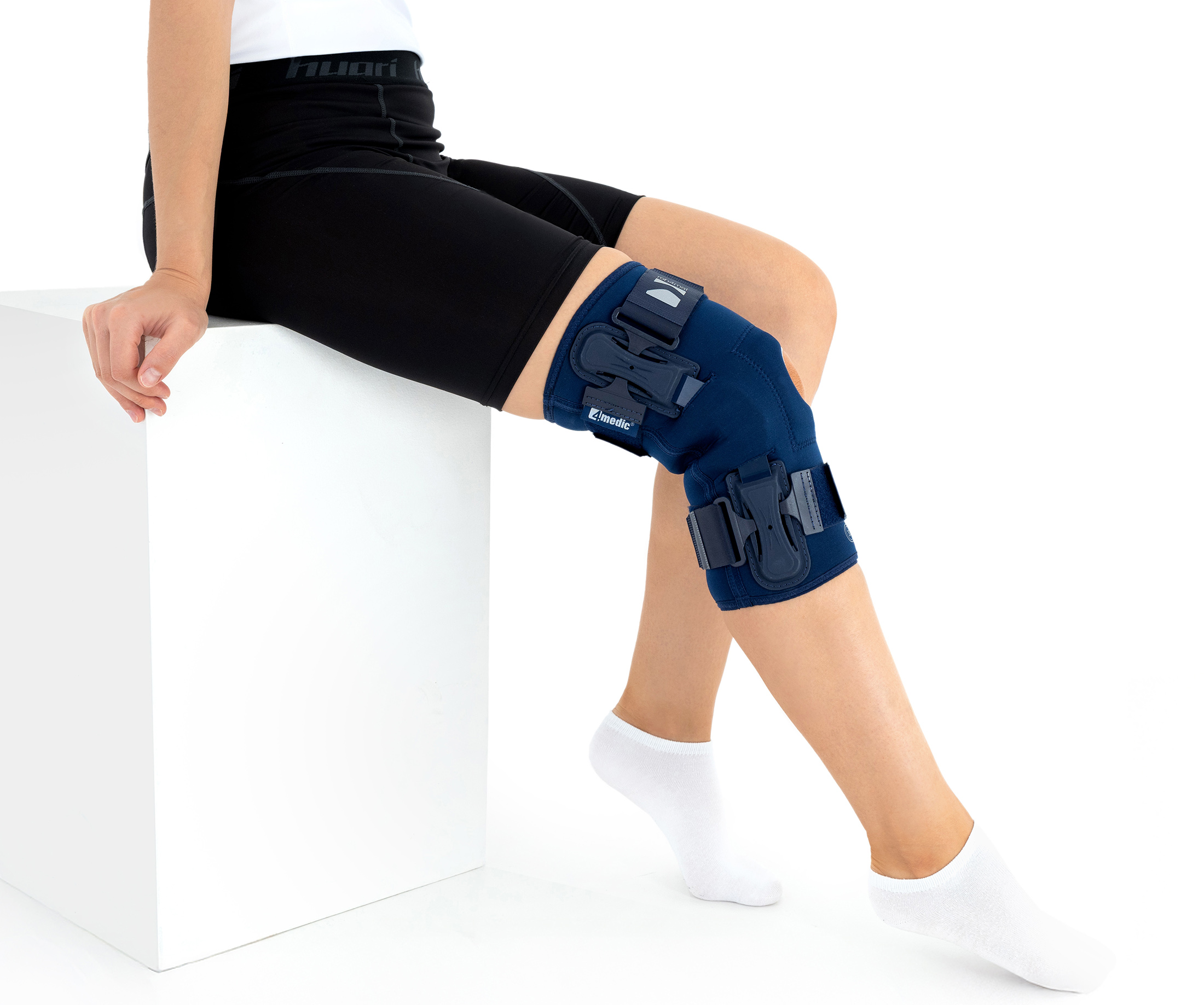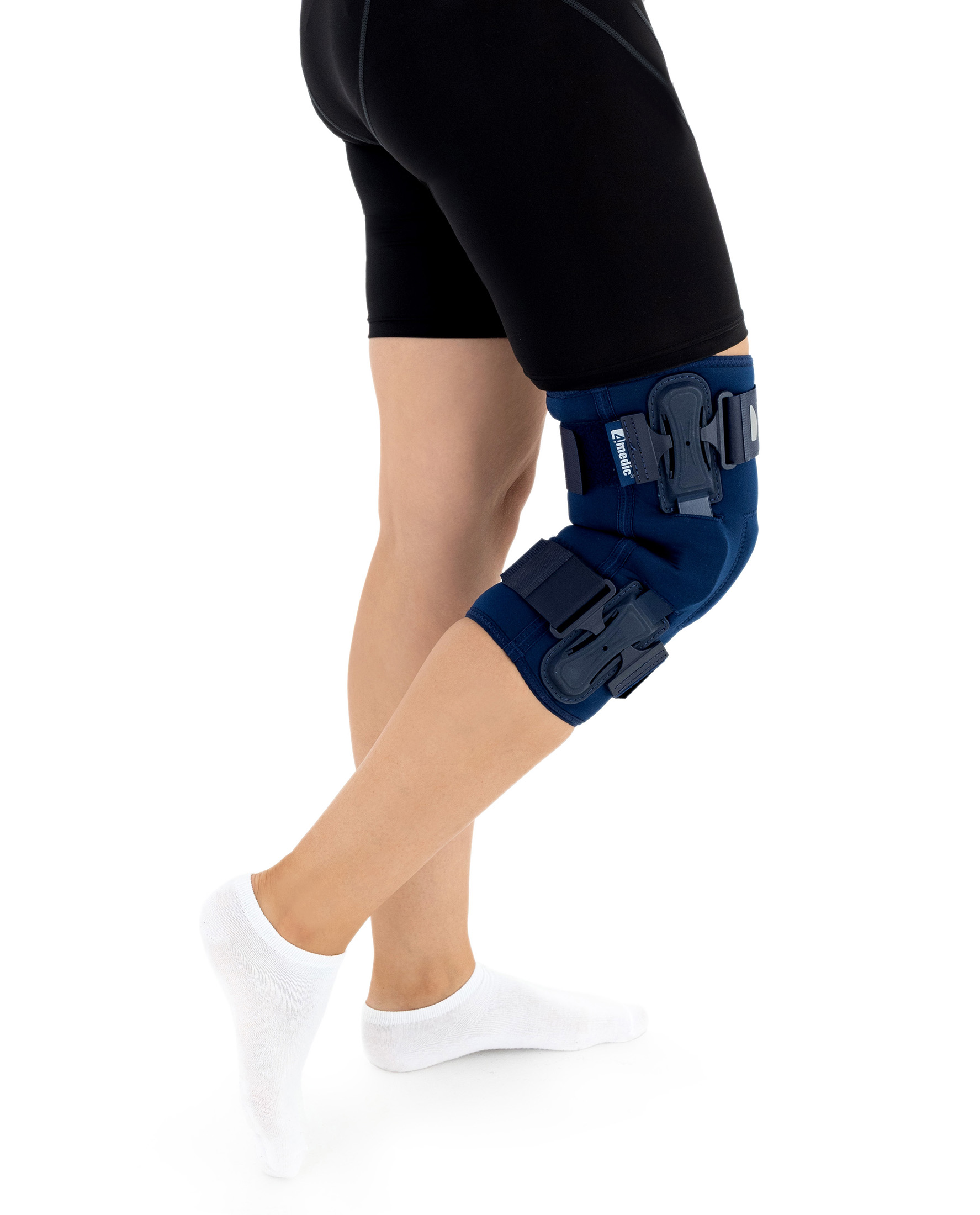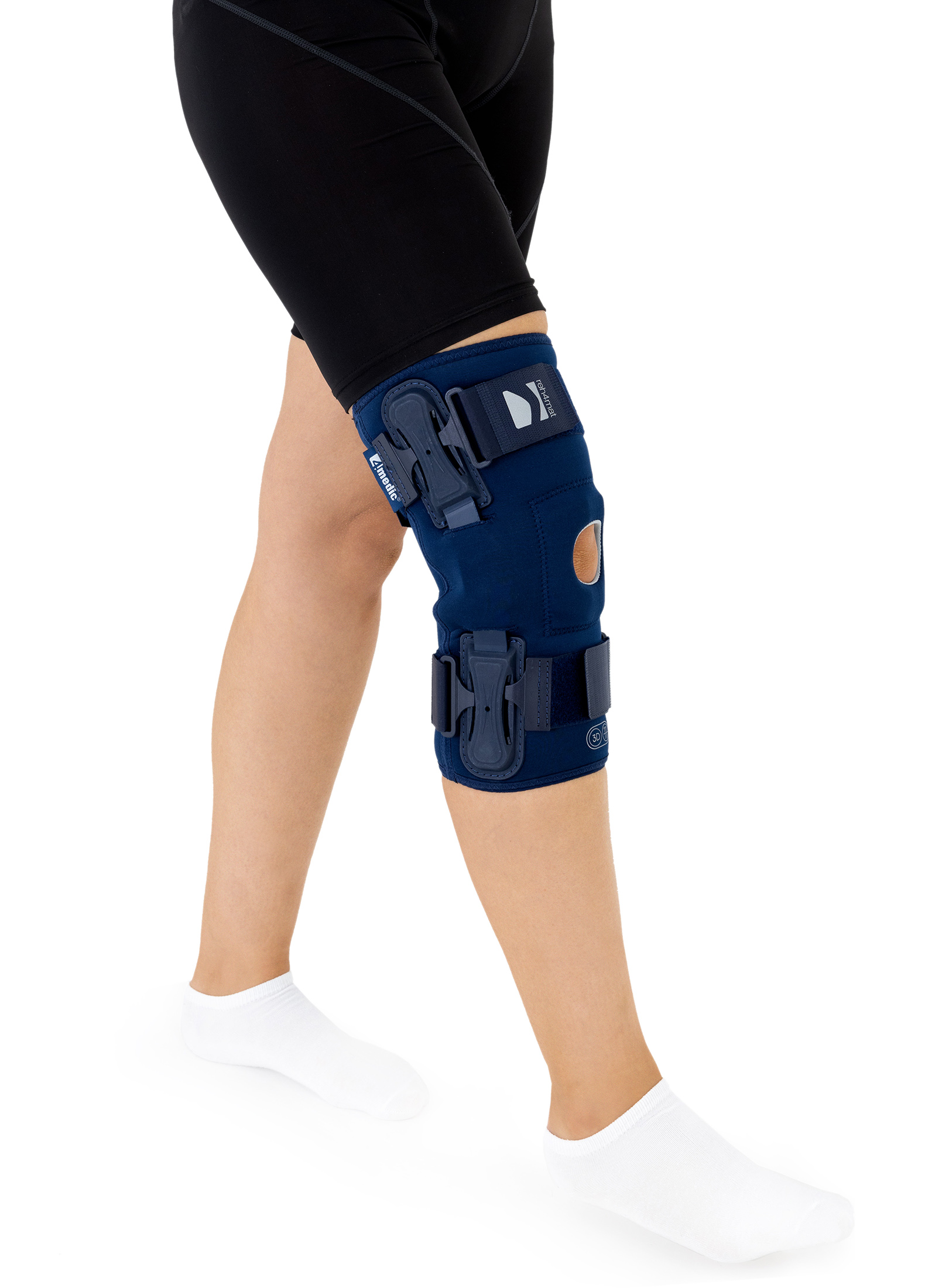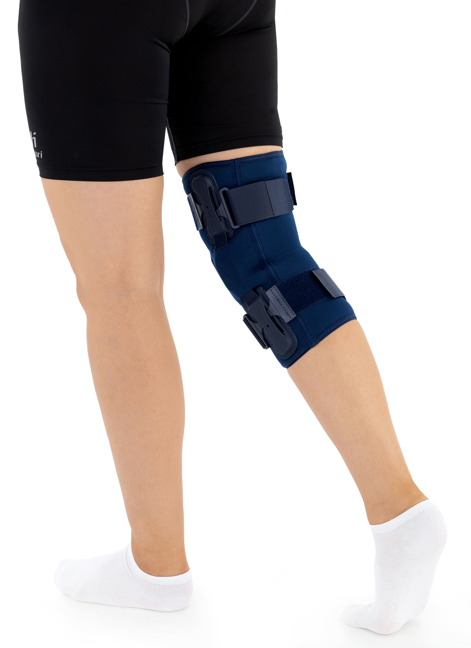 OKD-40 professional knee brace is equipped with durable lateral splints with dual-axis hinges for ensuring anatomical axial alignment of the knee and protect against uncontrolled joint displacement. The applied dual-axis knee hinges replicate the natural biomechanics of the knee joint, where rolling and gliding movements occur simultaneously during flexion and extension. The presence of two axes allows for improved control of this complex motion.