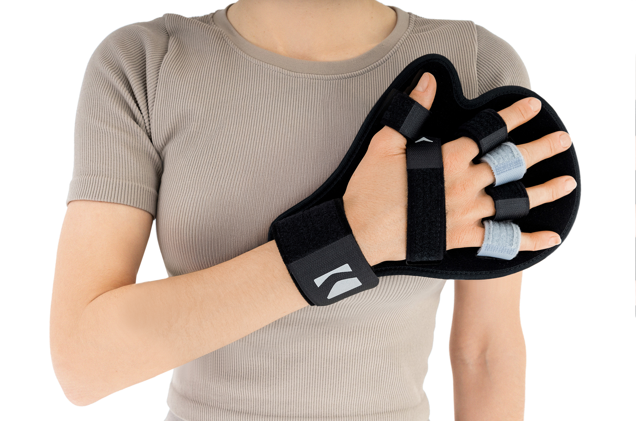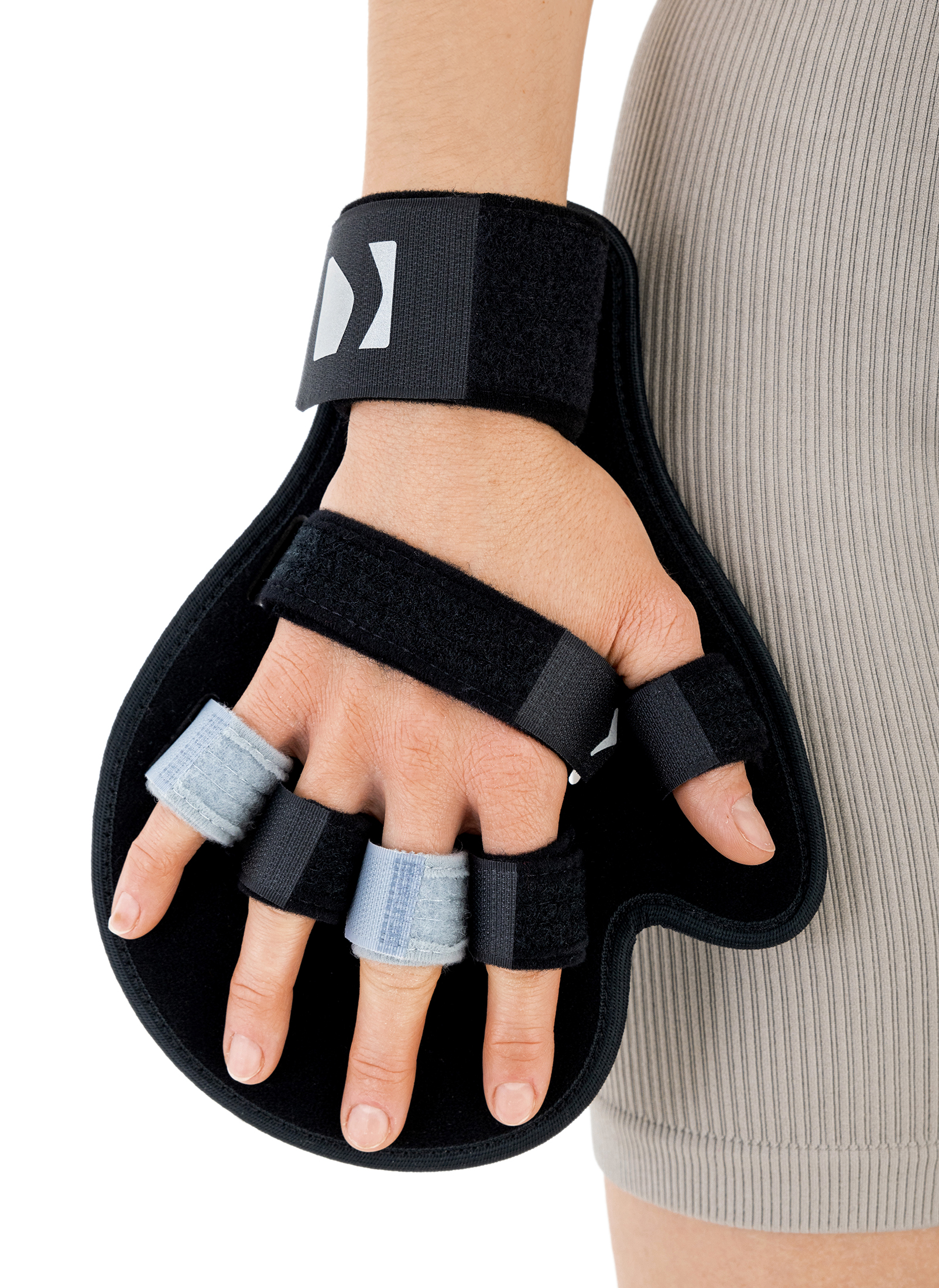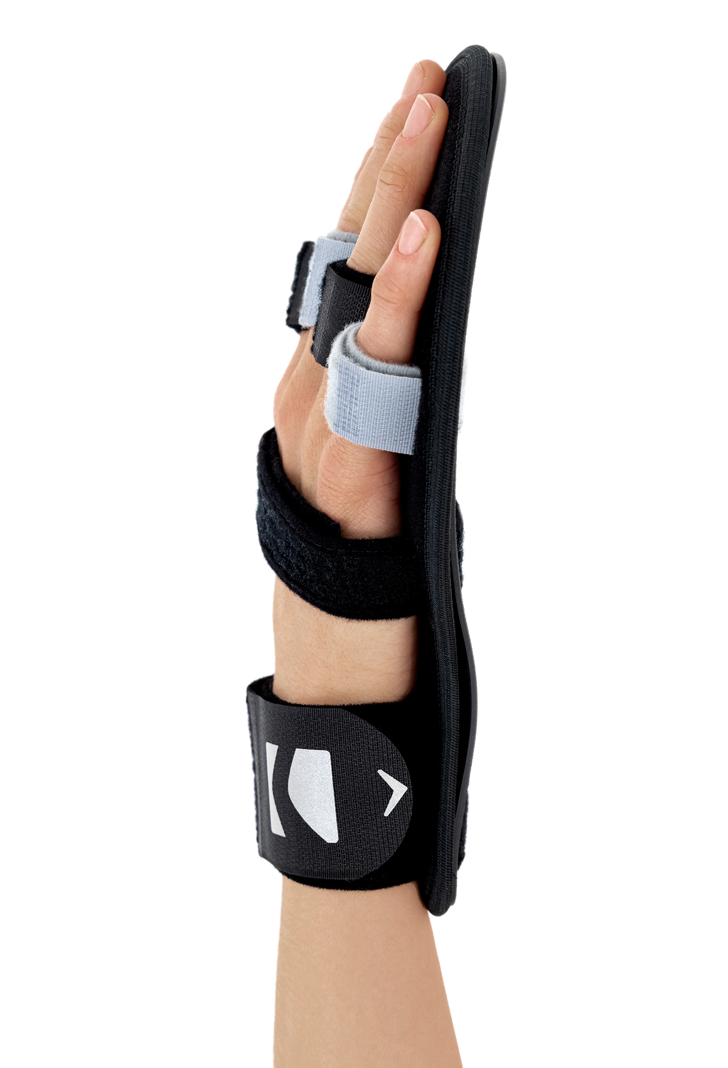 Stroke hand splint OKG-12 is a short, hand device which maintains it extended. Made of lightweight, thermoformated ABS and covered with skin friendly fabric ActiveDistance™.