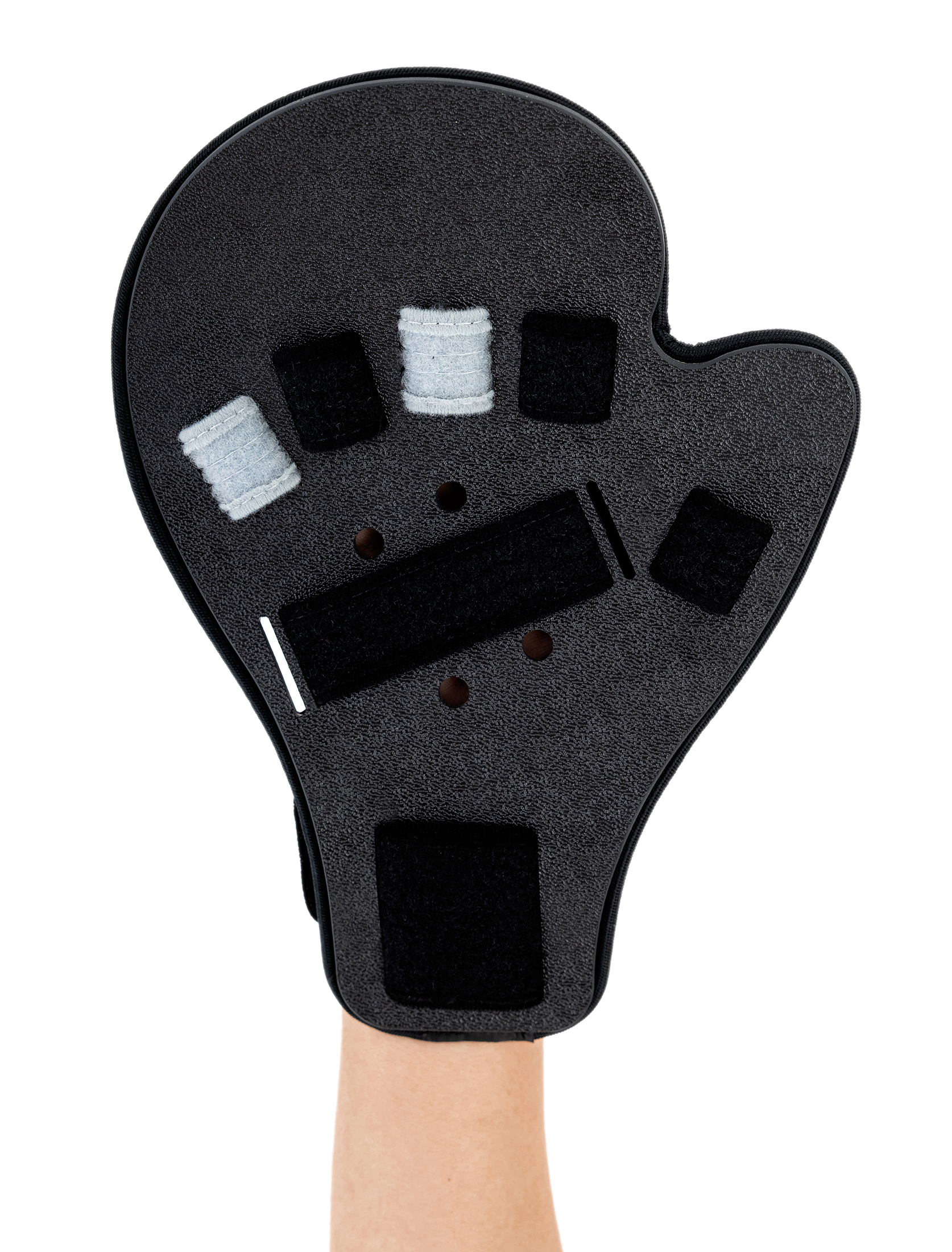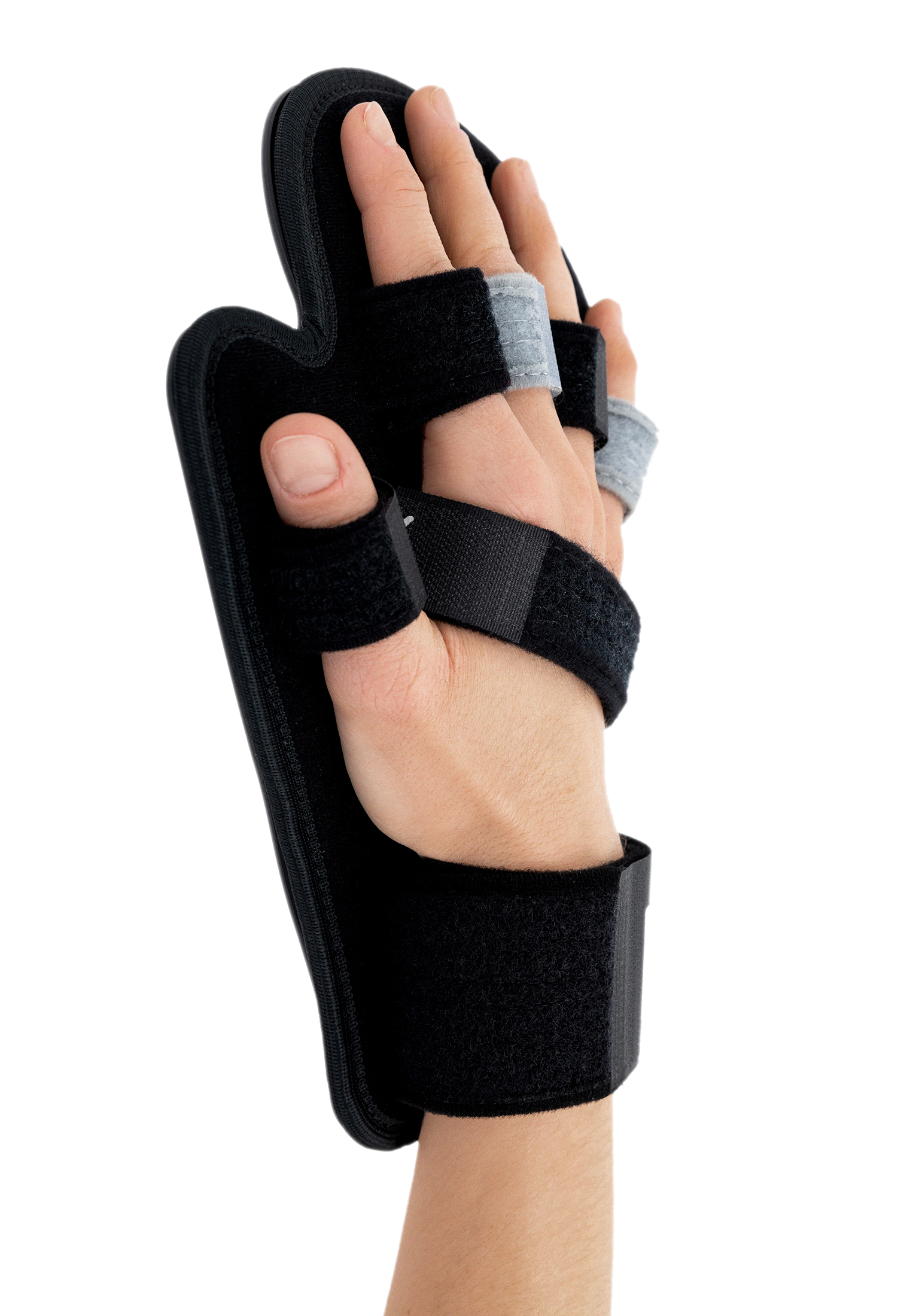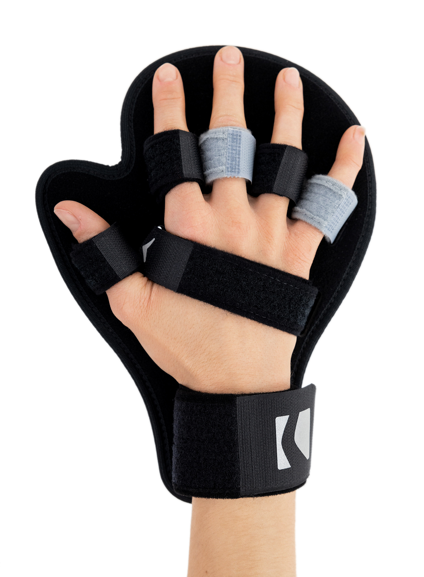 Stroke hand splint OKG-12 is a short, hand device which maintains it extended. Made of lightweight, thermoformated ABS and covered with skin friendly fabric ActiveDistance™.
