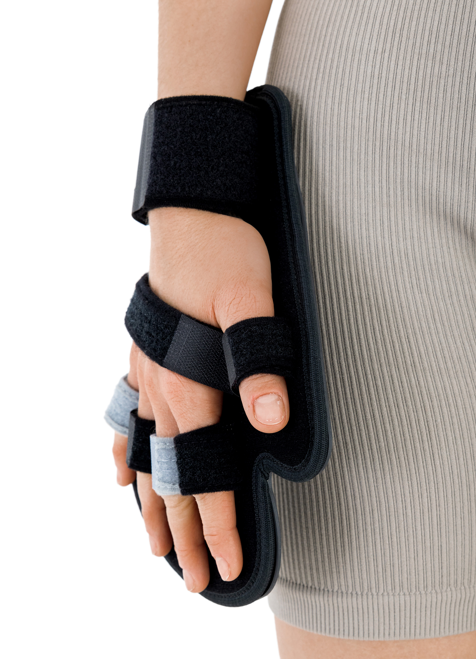 Full stiffening of the palm brace is a unique solution made of ABS material. The stiffening is anatomically designed and covers the right and left hands. It has a system of special cutouts for elastic straps that stabilize each finger separately and the wrist. From the bottom of the patient’s palm there is a perforation system thanks to which the hand is ventilated.