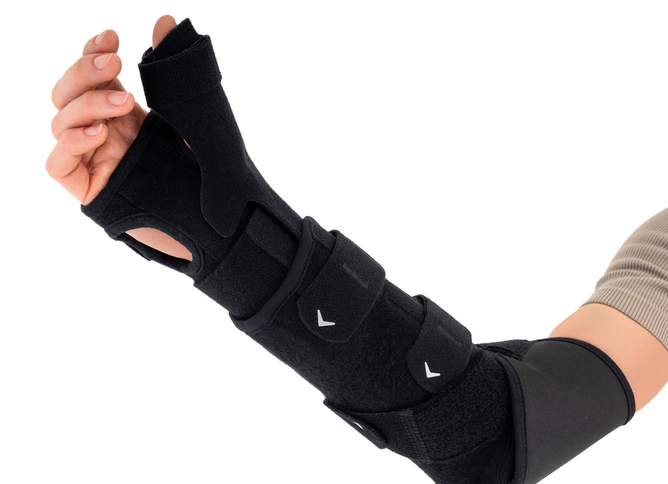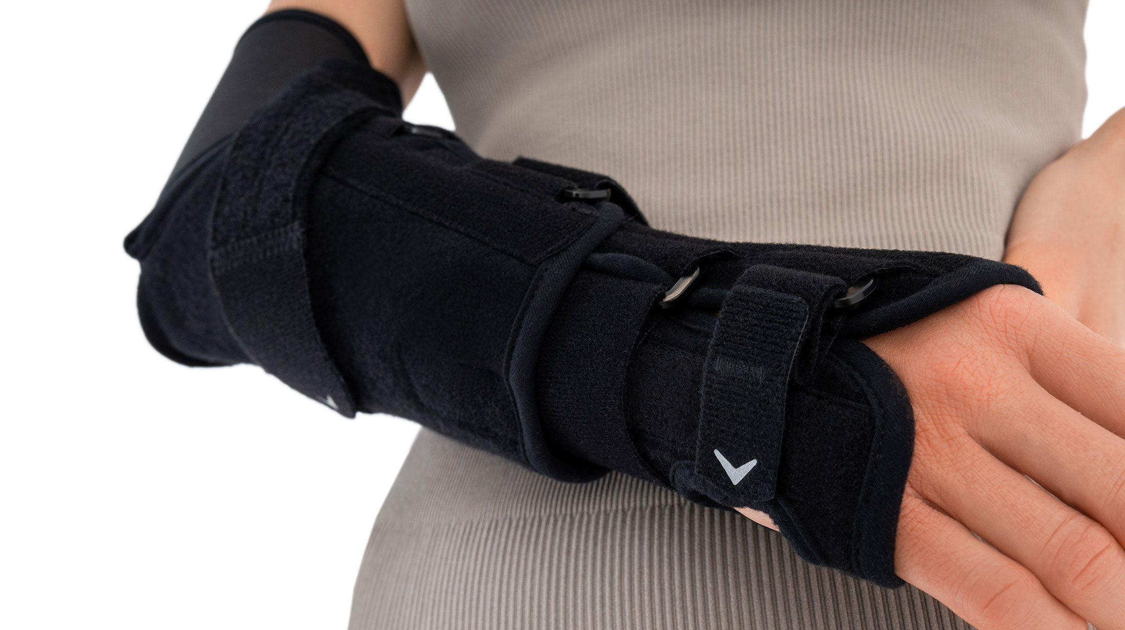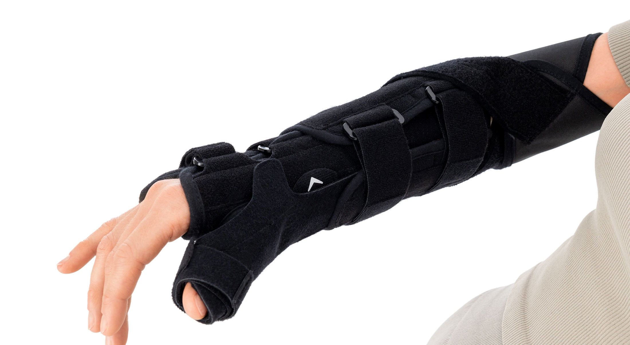 Wrist splint stabilizes the radiocarpal joint in a physiological position. It also features an optional thumb spica splint, keeping the thumb in neutral abduction and stabilizing the carpometacarpal (saddle) joint.