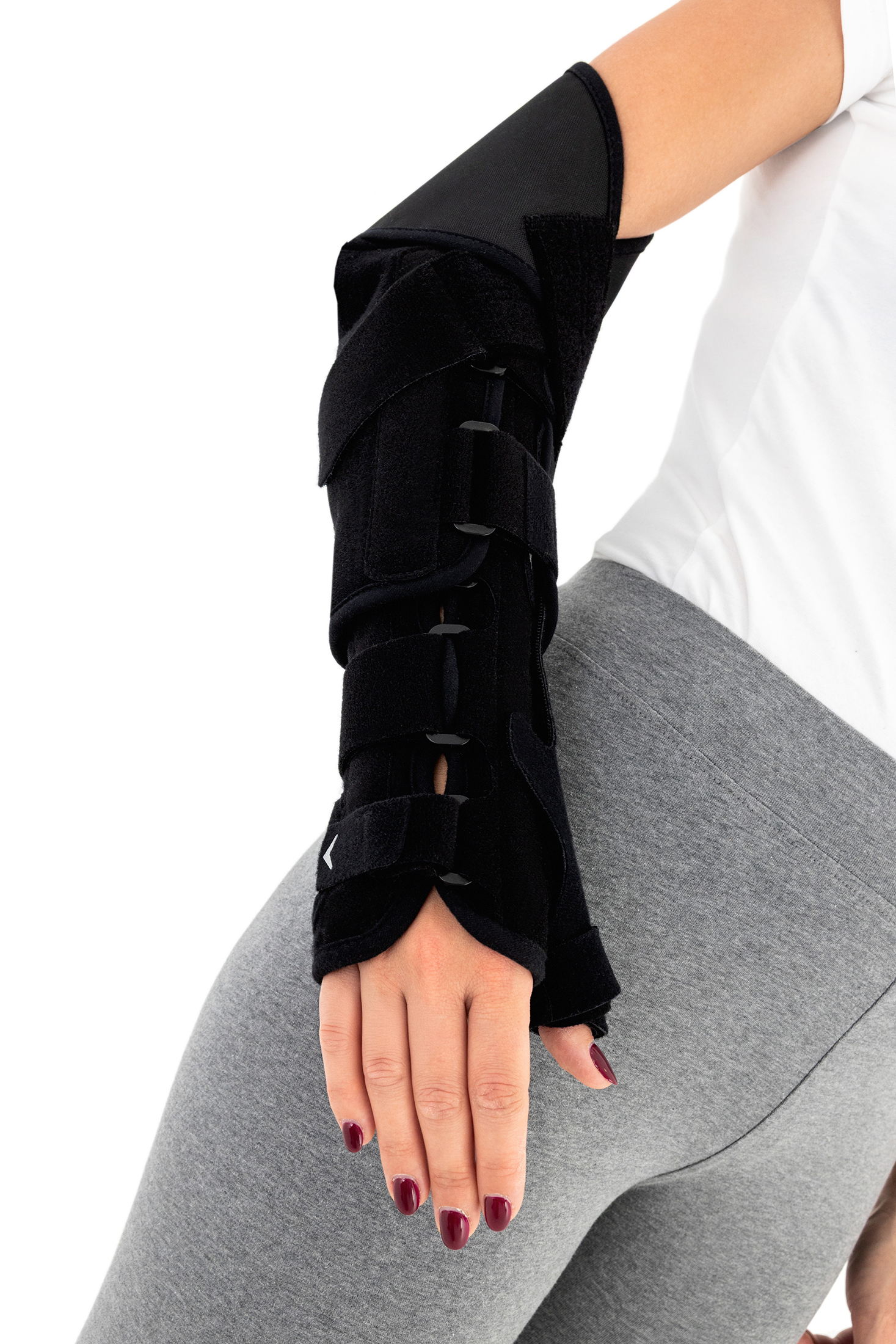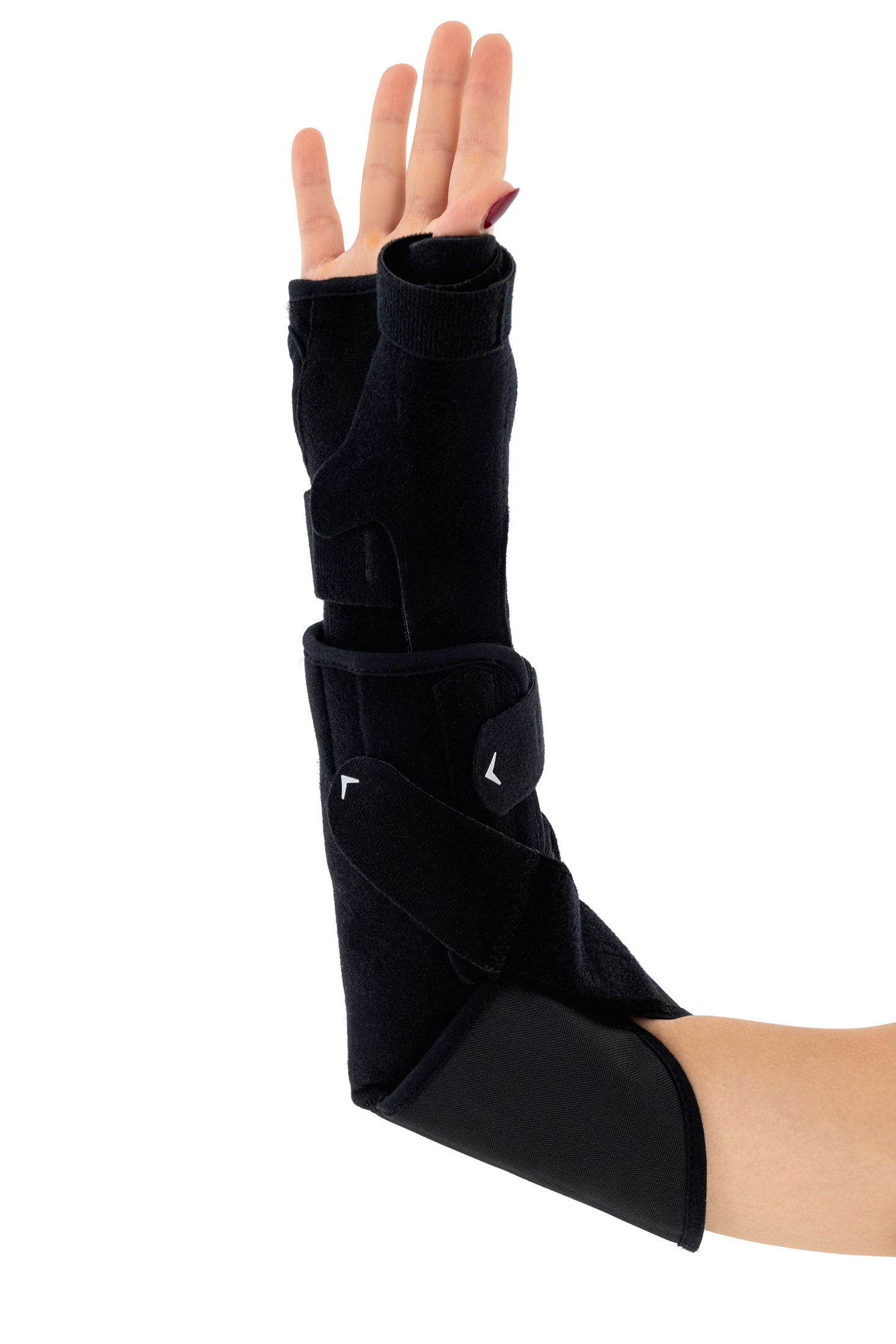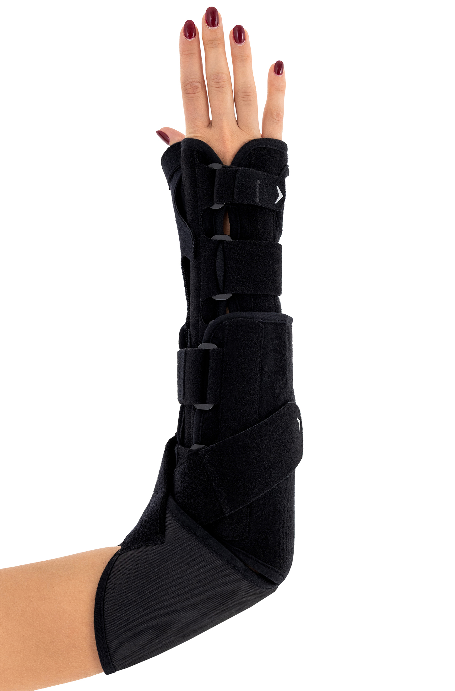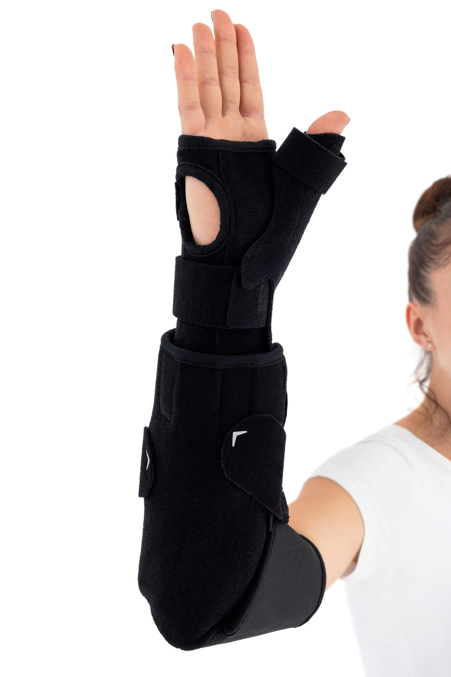 Wrist splint stabilizes the radiocarpal joint in a physiological position. It also features an optional thumb spica splint, keeping the thumb in neutral abduction and stabilizing the carpometacarpal (saddle) joint.