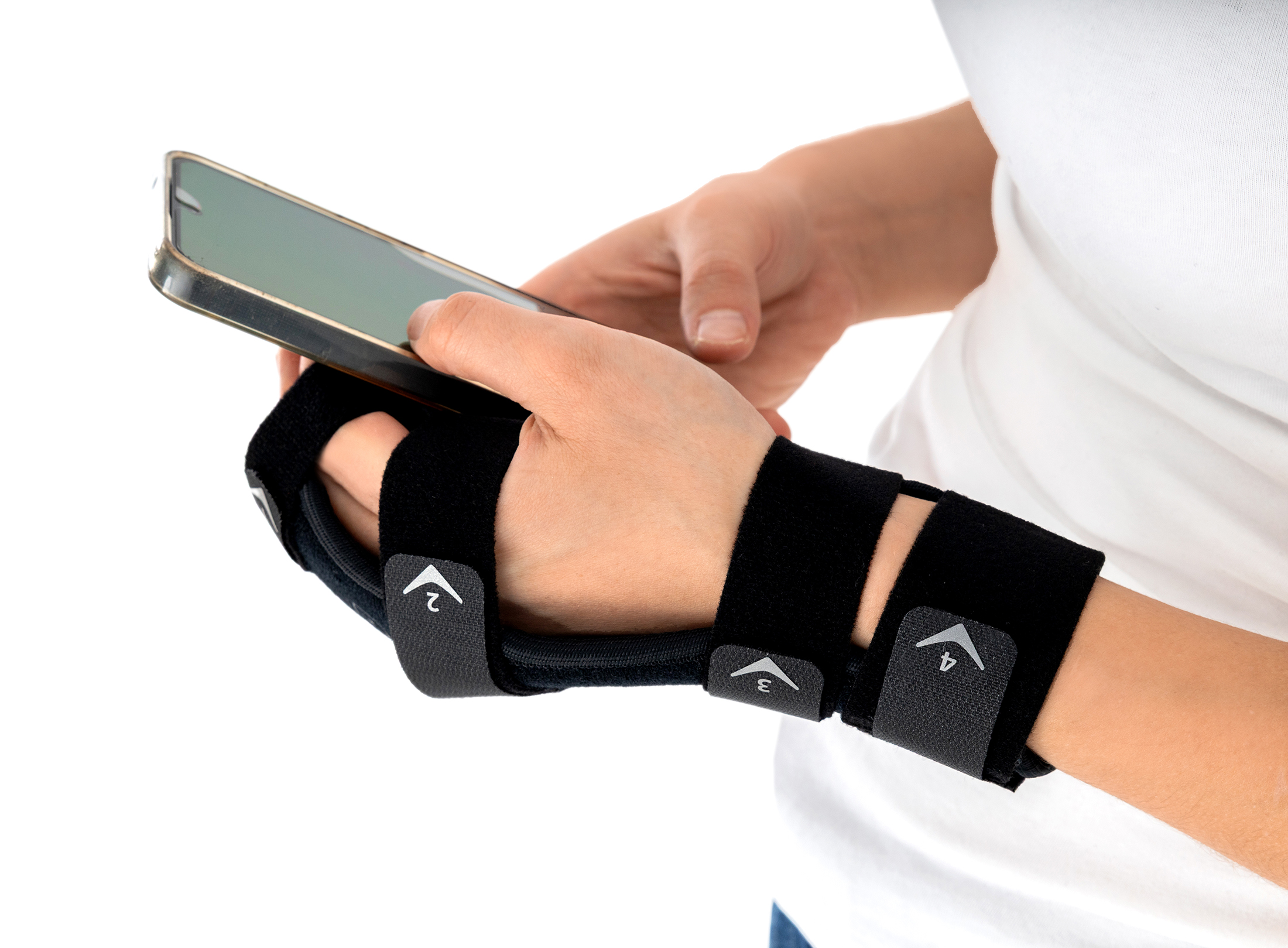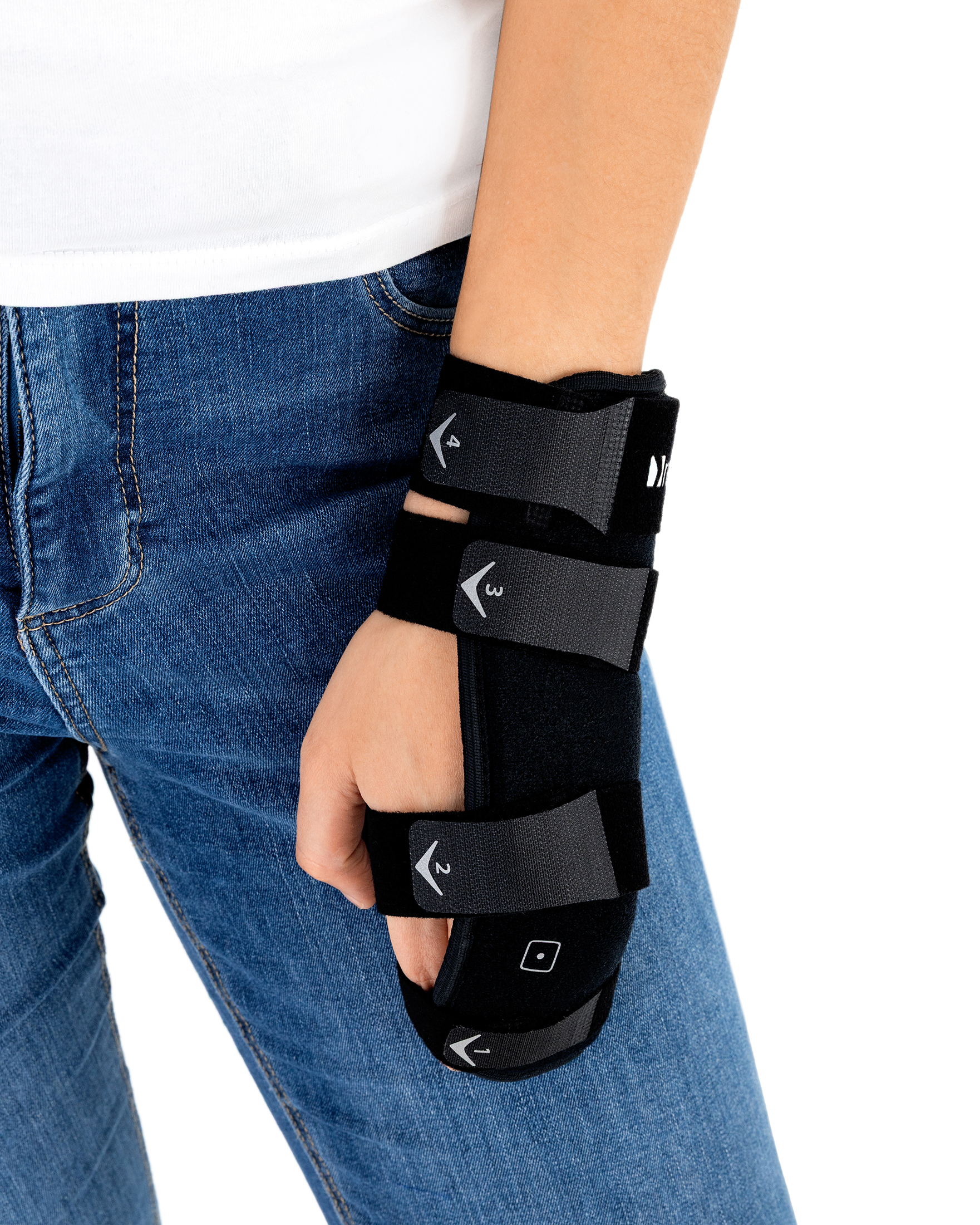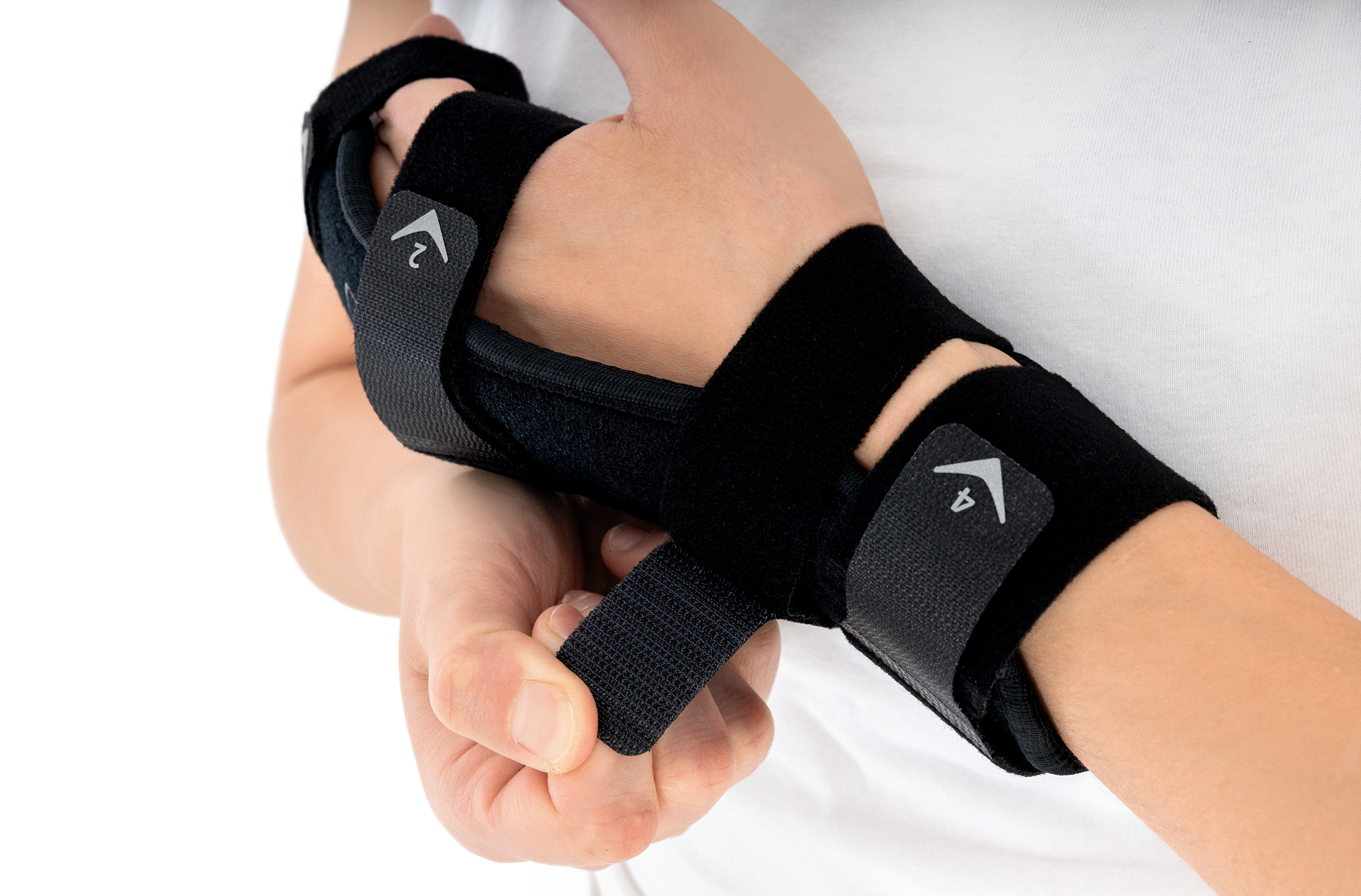 System regulowanych pasków z zapięciem na rzep umożliwia precyzyjne dopasowanie ortezy do dłoni oraz stabilne utrzymanie jej na miejscu w trakcie noszenia. Otwarta konstrukcja ułatwia aplikację produktu, zapewnia odpowiednią wentylację skóry i zmniejsza ryzyko podrażnień.