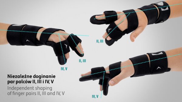 Aluminiowe usztywnienie zapewnia bezpieczne unieruchomienie i daje możliwość profesjonalnego dopasowania do anatomicznych kształtów i utrzymania palców w terapeutycznej fizjologicznej pozycji, czyli w lekkim funkcjonalnym zgięciu.